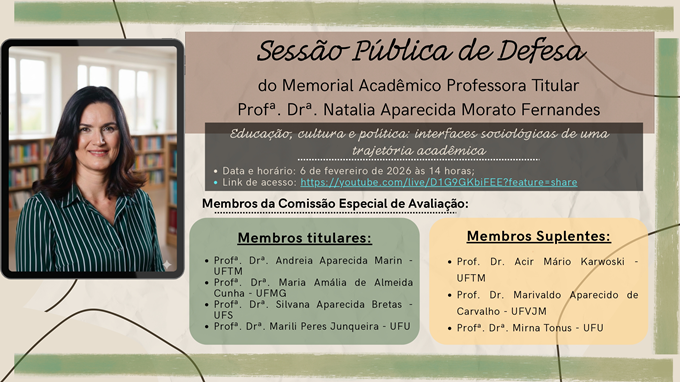 A Universidade Federal do Triângulo Mineiro (UFTM) convida a comunidade acadêmica e demais interessados para a Sessão Pública de Defesa do Memorial Acadêmico da Professora Titular Profª. Drª. Natalia Aparecida Morato Fernandes, etapa integrante do processo de promoção à classe de Professor Titular.