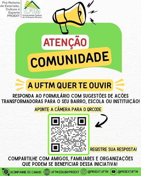 A Pró-reitoria de Extensão, Cultura e Esporte (PROEXT) da UFTM convida a todos a participar da Consulta à Comunidade, um formulário criado para ouvir demandas, desafios e...