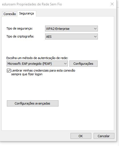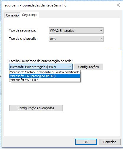 Passo 7: selecionar o método de autenticação de rede EAP-PEAP. Depois clicar em Configurações: