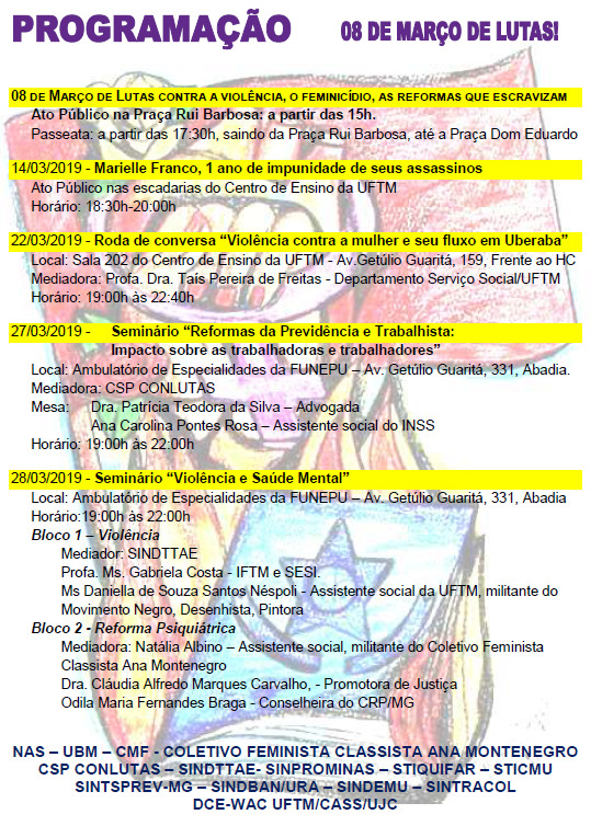 O Movimento 8 de Março de Lutas, em parceria com a UFTM, promove Roda de Conversa "A mulher vítima de violência e o seu atendimento em Uberaba-MG” às 19 horas do dia 22 de março, na sala 202 do Centro Educacional. Podem participar servidores, docentes e alunos da Universidade, técnicos e gestores dos serviços de atendimento à mulher e entidades civis de defesa e representação das mulheres.