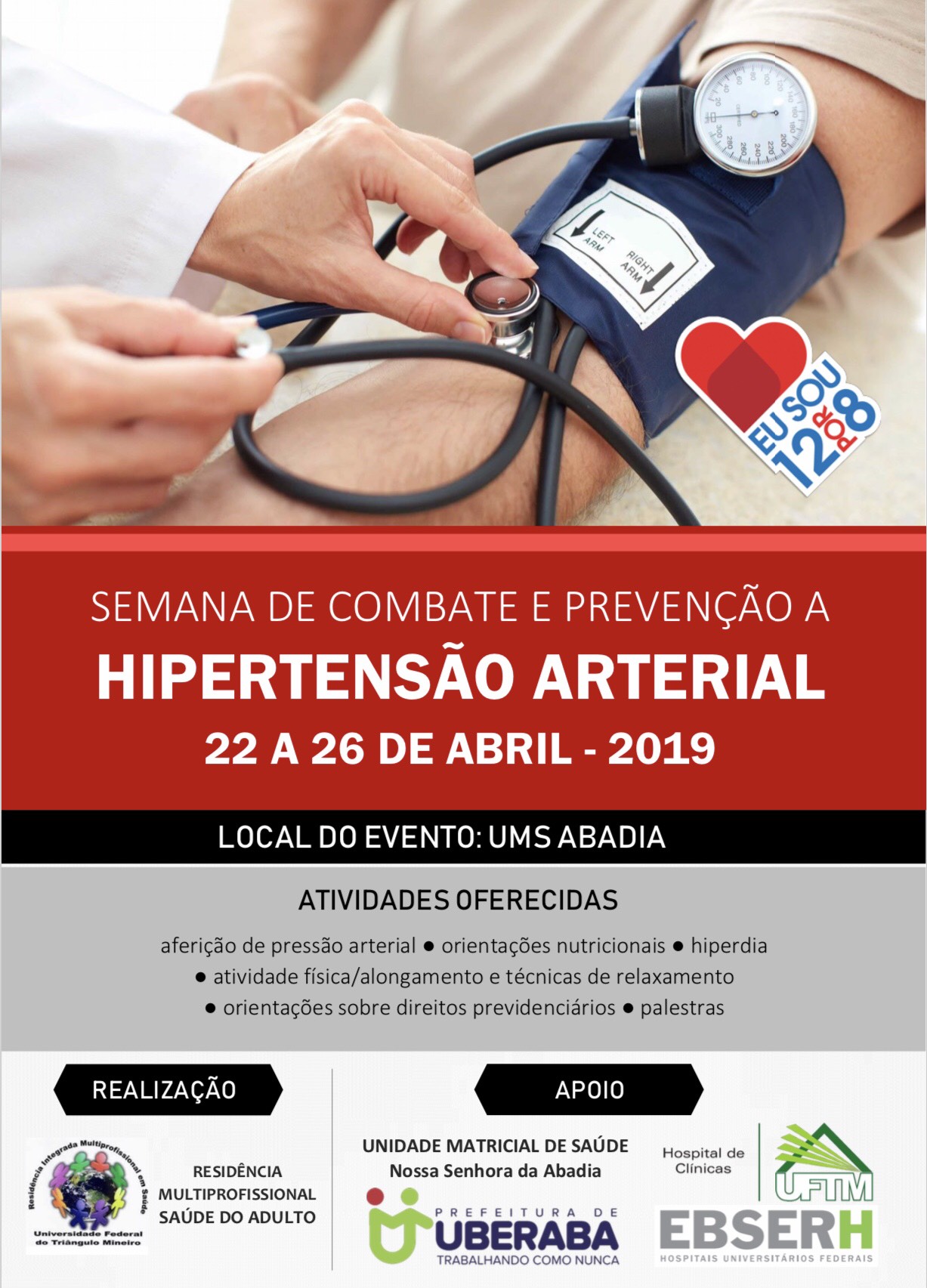 O Programa de Residência Multiprofissional em Saúde do Adulto da UFTM promove uma semana de atividades para marcar o Dia de Combate e Prevenção à Hipertensão Arterial, do dia 22 a 26 de abril, na Unidade Matricial de Saúde - UMS, no bairro Abadia, em Uberaba - MG.