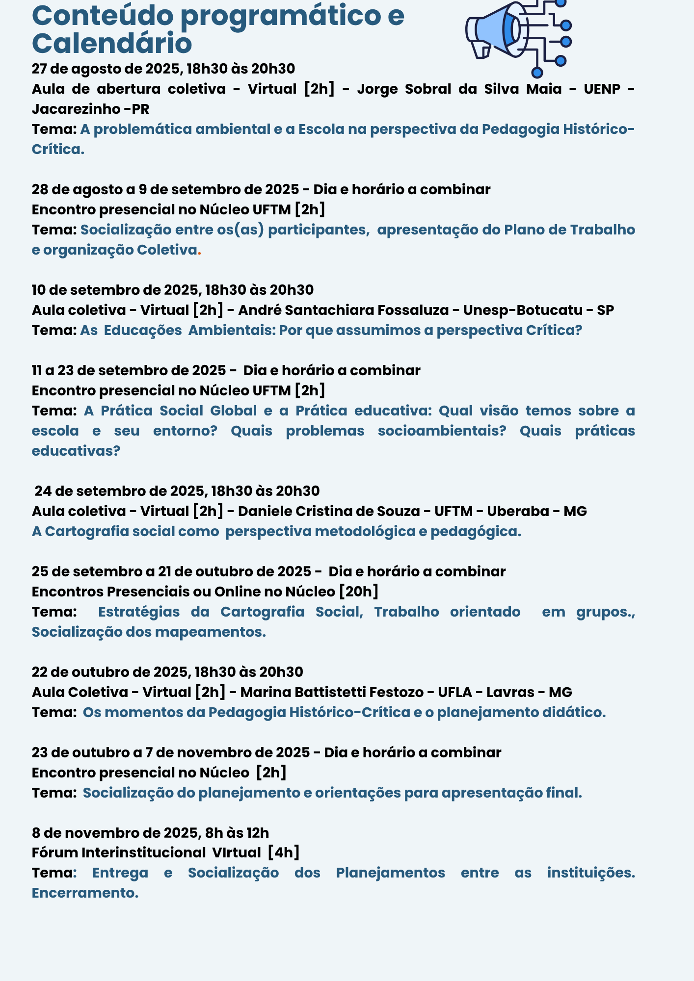 O objetivo do curso é realizar discussões e práticas que permitam compreender a realidade socioambiental do entorno da escola, a partir da realização de cartografias e planejamentos para a educação ambiental escolar. O público-alvo são professores da educação básica de todas as áreas de conhecimento e níveis de ensino de Uberaba e estudantes de licenciaturas da UFTM. Os matriculados e matriculadas em Uberaba receberão certificado da UFTM, desde que cumpra 75% das atividades do curso.