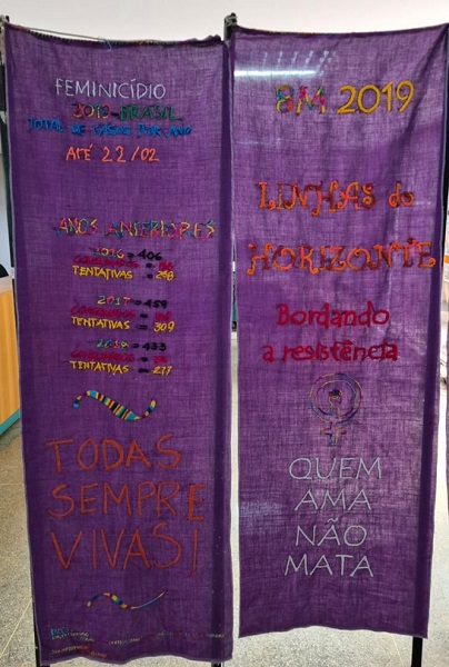 Em 1980 surgiu o “Movimento Quem Ama não Mata”, idealizado pela socióloga Elizabeth Fleury. Nesta década houve assassinatos de mulheres em nome da “legítima defesa da honra”. Décadas após, em 2019, o Coletivo Linhas do Horizonte (@linhasdohorizonte) teceu uma série de onze painéis têxteis. Cada painel estampa por meio do bordado manual o nome de cada mulher que foi vítima do feminicídio, 300 nomes foram bordados. “Este dado está conforme a quantidade de casos de feminicídio no país no período de janeiro e fevereiro de 2019. Com curadoria de Gláucia Batista, a mostra envolve casos relacionados a feminicídio, tentados ou consumados em todo o país”, afirmou o professor Alberto.