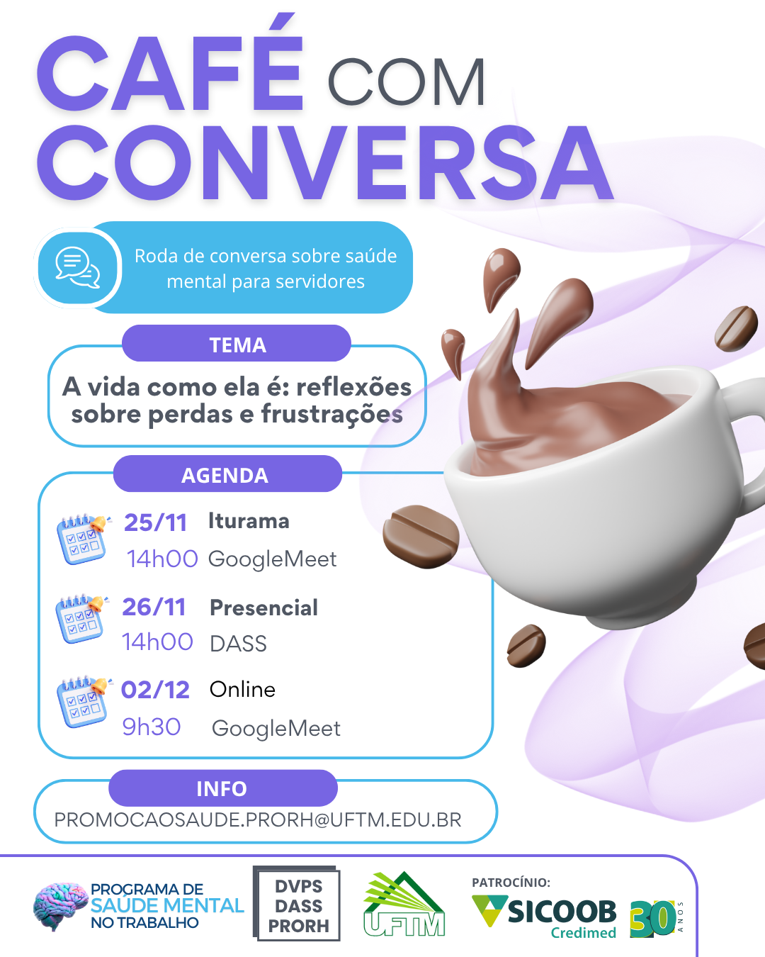 “A vida como ela é: reflexões sobre perdas e frustrações” é o tema do próximo encontro do Café com Conversa. A roda de conversa propõe promover um espaço de acolhimento...