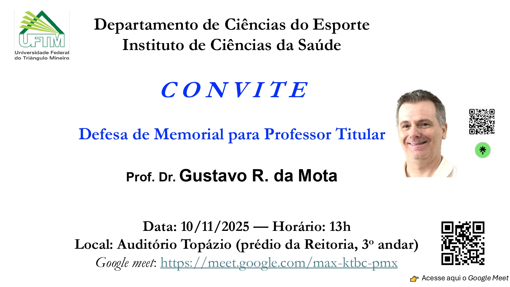 O Departamento de Ciências do Esporte da Universidade Federal do Triângulo Mineiro (UFTM) convida a comunidade acadêmica e interessados para a defesa pública do Memorial da...
