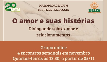 O “Grupo Amor e suas histórias: dialogando sobre amor e relacionamentos”, organizado pela Divisão de Atenção Estudantil em Saúde (DIAES/PROACE), abre inscrições para a comunidade...