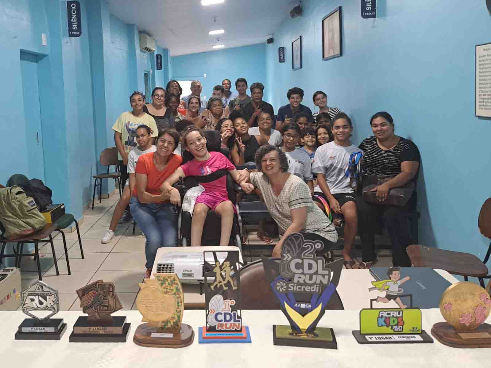 Paratleta Káren Maria Pessato Jerônimo e sua mãe, profa. Luciana Vaz e participantes do encontro. O projeto de extensão "Jovens Lírios: refletindo sobre valores humanos e...