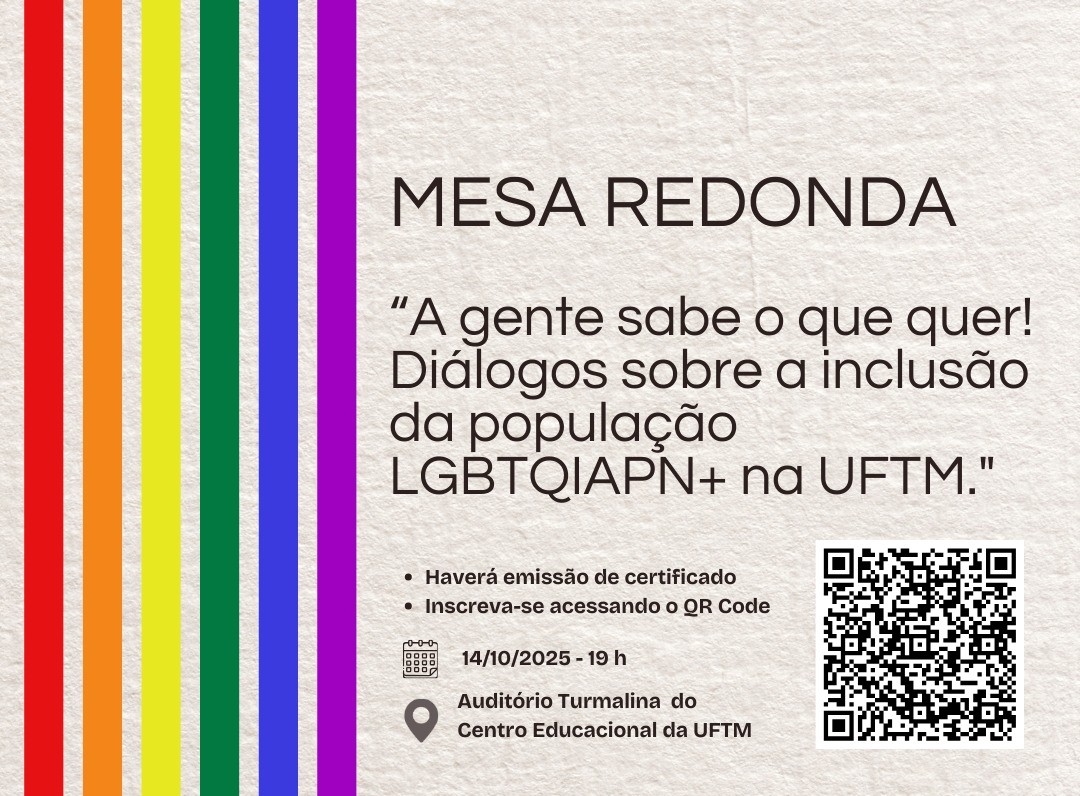 Dia 14 de outubro acontecerá a Mesa-redonda "A gente sabe o que quer! Diálogos sobre a inclusão da população LGBTQIAPN+ na UFTM". O encontro é uma parceria entre o Instituto de...
