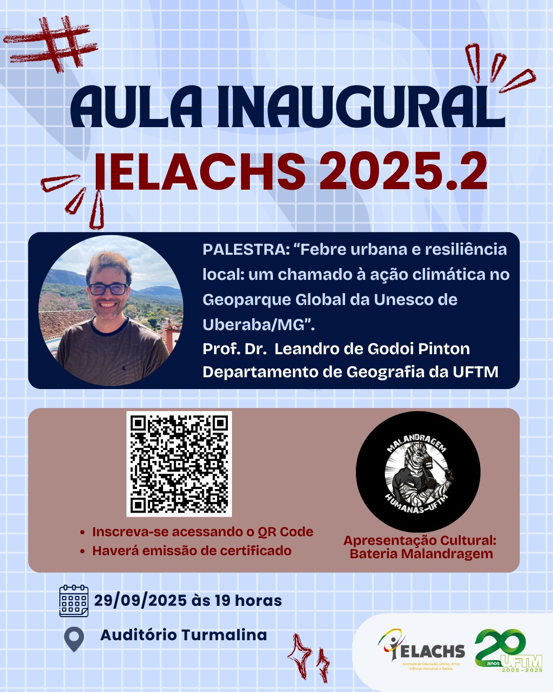 No dia 29 de setembro, às 19h, acontecerá a Aula Inaugural IELACHS 2025.2. O evento será no Auditório Turmalina, localizado no Centro Educacional UFTM. Na Aula Inaugural, o...